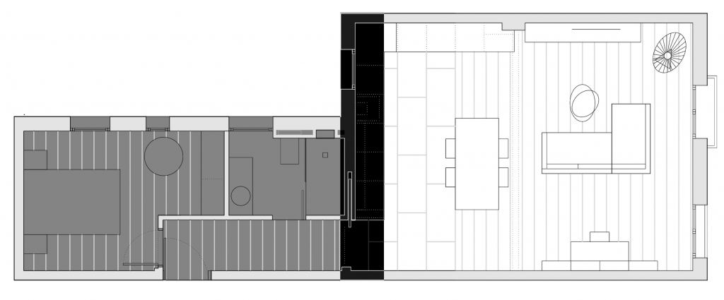 AVVA explora las potencialidades del loft integrando en una gran sala de 5 x 7 metros abierta al exterior las funciones de una vivienda y de un espacio de trabajo. De esta habitación única se segregan únicamente dos piezas compactas, baño y dormitorio, diseñados en su mínima expresión funcional para dar servicio a la vida que se desarrolla íntegramente en la sala principal. El apéndice servidor integra igualmente las instalaciones de climatización de la vivienda, desde donde se impulsa el aire que climatiza el espacio diáfano. Dos grandes huecos ecualizan la relación del interior con el medio mediante un espeso arbolado caducifolio que actúa como un parasol en verano y permite la libre penetración de la radiación solar en invierno.