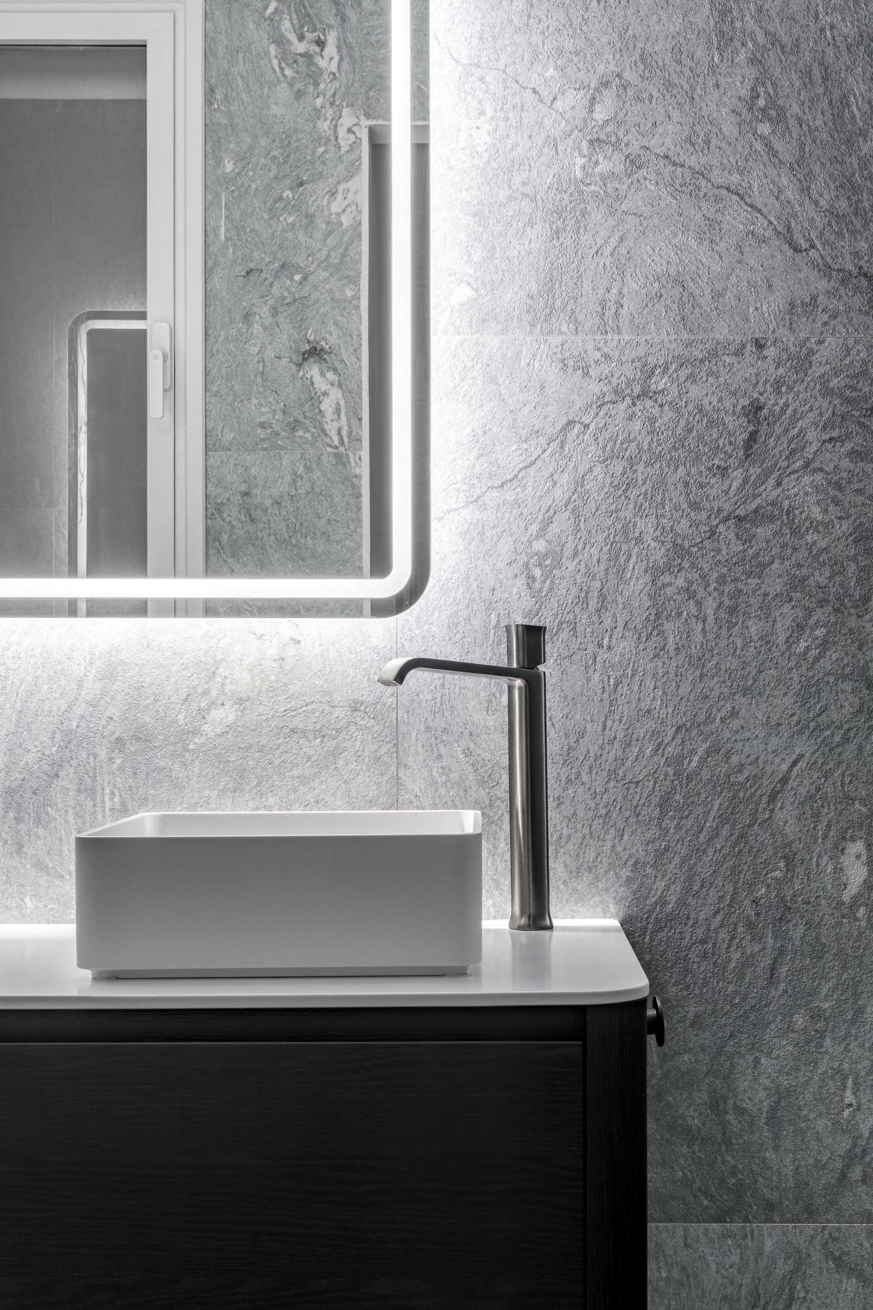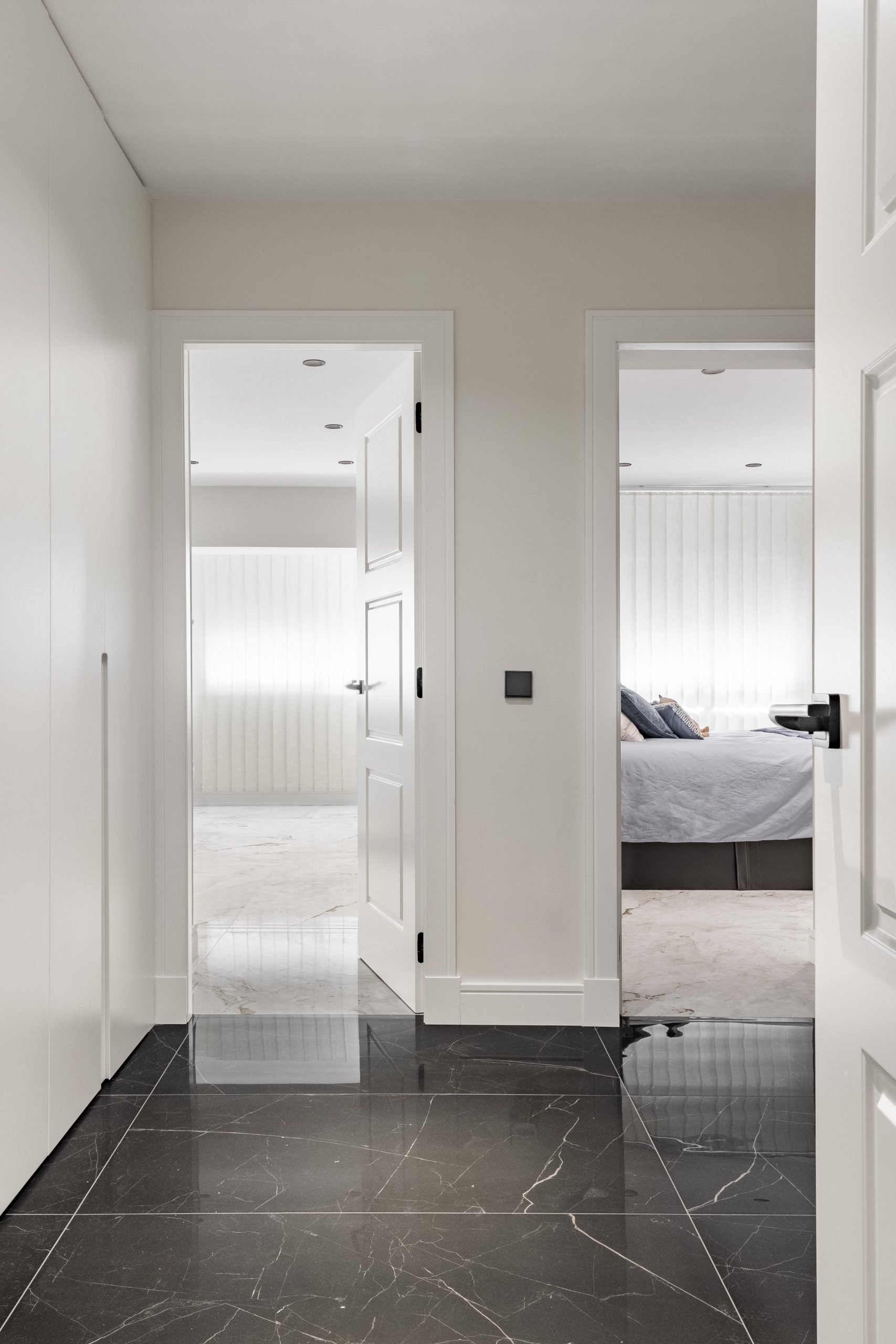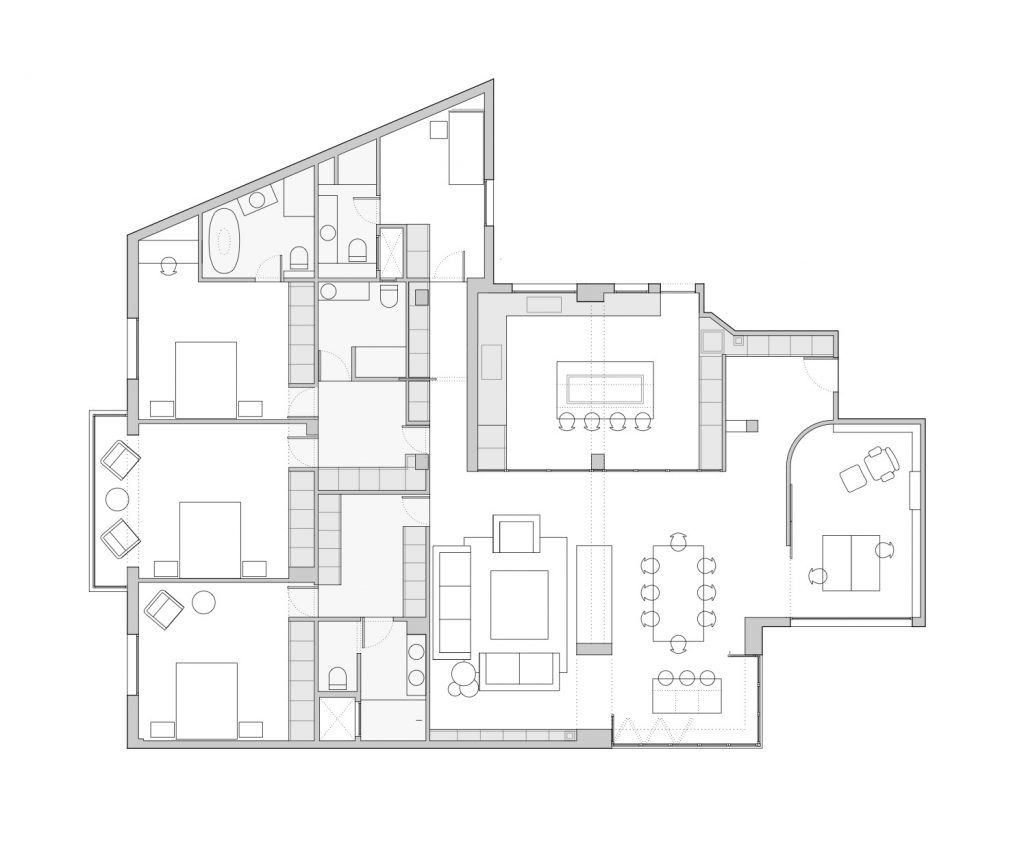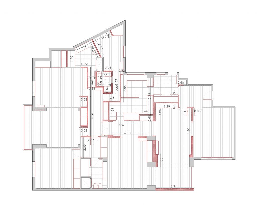 SST es una reforma residencial que parte de la revisión de los convencionalismos que organizan la vivienda burguesa tradicional para plantear una situación alternativa. La division espacial tradicional entre el circuito de servicio, los espacios de recepción social y el ámbito familiar privado, es superada por una estrategia distinta: una banda de servicio que divide las esferas de lo íntimo y lo compartido y que sirve a una serie de habitaciones de similar superficie y calidad, despojadas de criterios familiares jerárquicos. Esta banda se evidencia a través de un pavimento de mármol negro pulido que contrasta con la luminosidad que caracteriza el resto de la vivienda. Los espacios comunitarios, a su vez, se articulan en torno a elementos totémicos igualmente construidos en mármol negro, como la gran isla que preside la cocina, dominando y organizan el espacio con su imponente presencia.