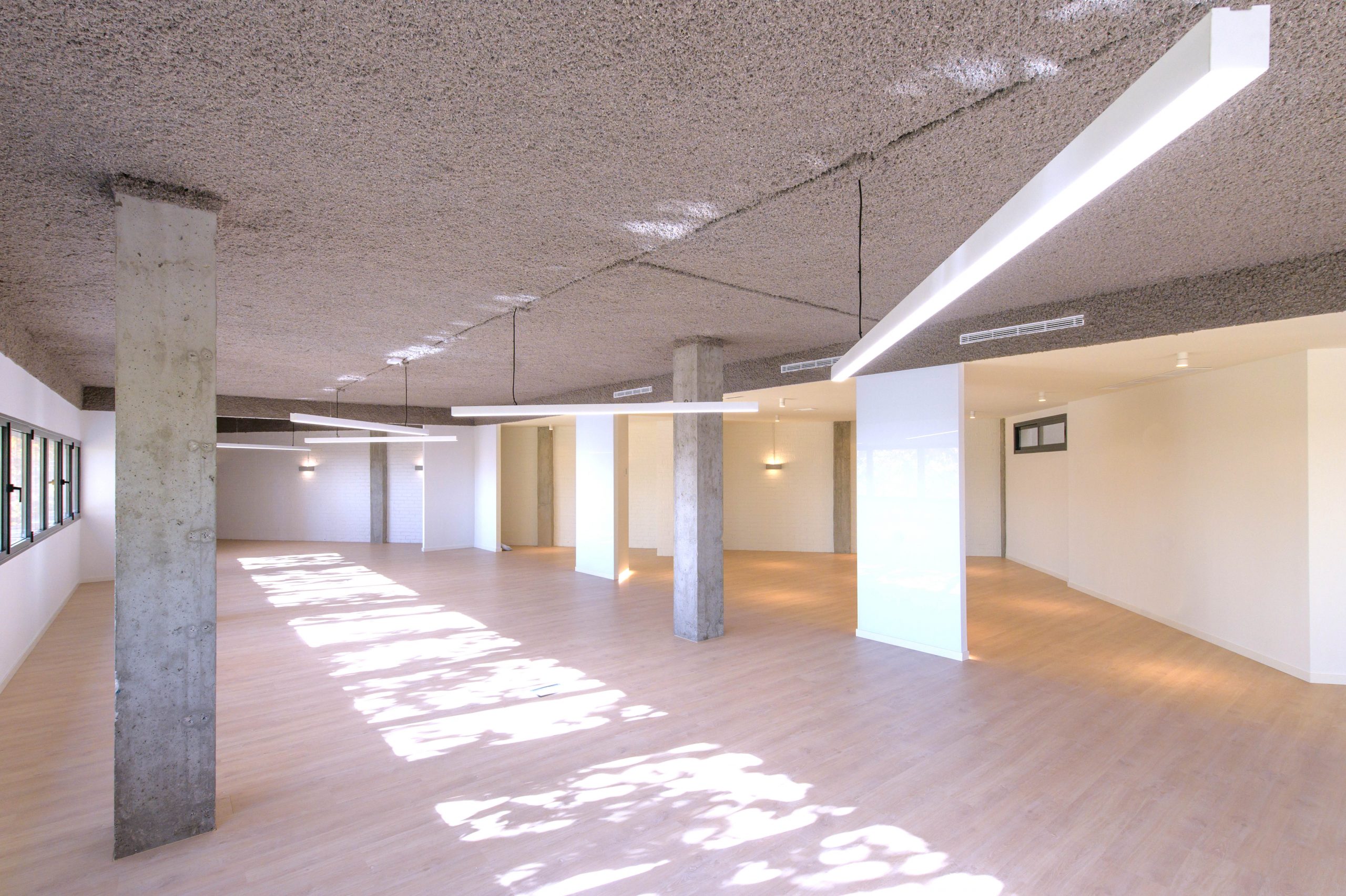 Las oficinas VRD son el resultado del acondicionamiento de un local con una compleja planta triangular para el uso como oficina flexible. El espacio se divide en dos mediante una partición paralela al cerramiento exterior que separa el espacio diáfano de trabajo de una concatenación de espacios de servicio: recepción, instalaciones, aseos, office, despachos, almacén… La franja de servicio y espacios compartimentados, a través de la cual se accede a todos los espacios de la oficina, presenta una menor altura y una cálida iluminación uniforme a base de una retícula de focos empotrados. Por el contrario, el espacio diáfano de trabajo está equipado mediante luminarias suspendidas que aprovechan su mayor altura y se acondiciona acústicamente mediante un proyectado de celulosa reciclada que unifica y dota al espacio de una textura única.