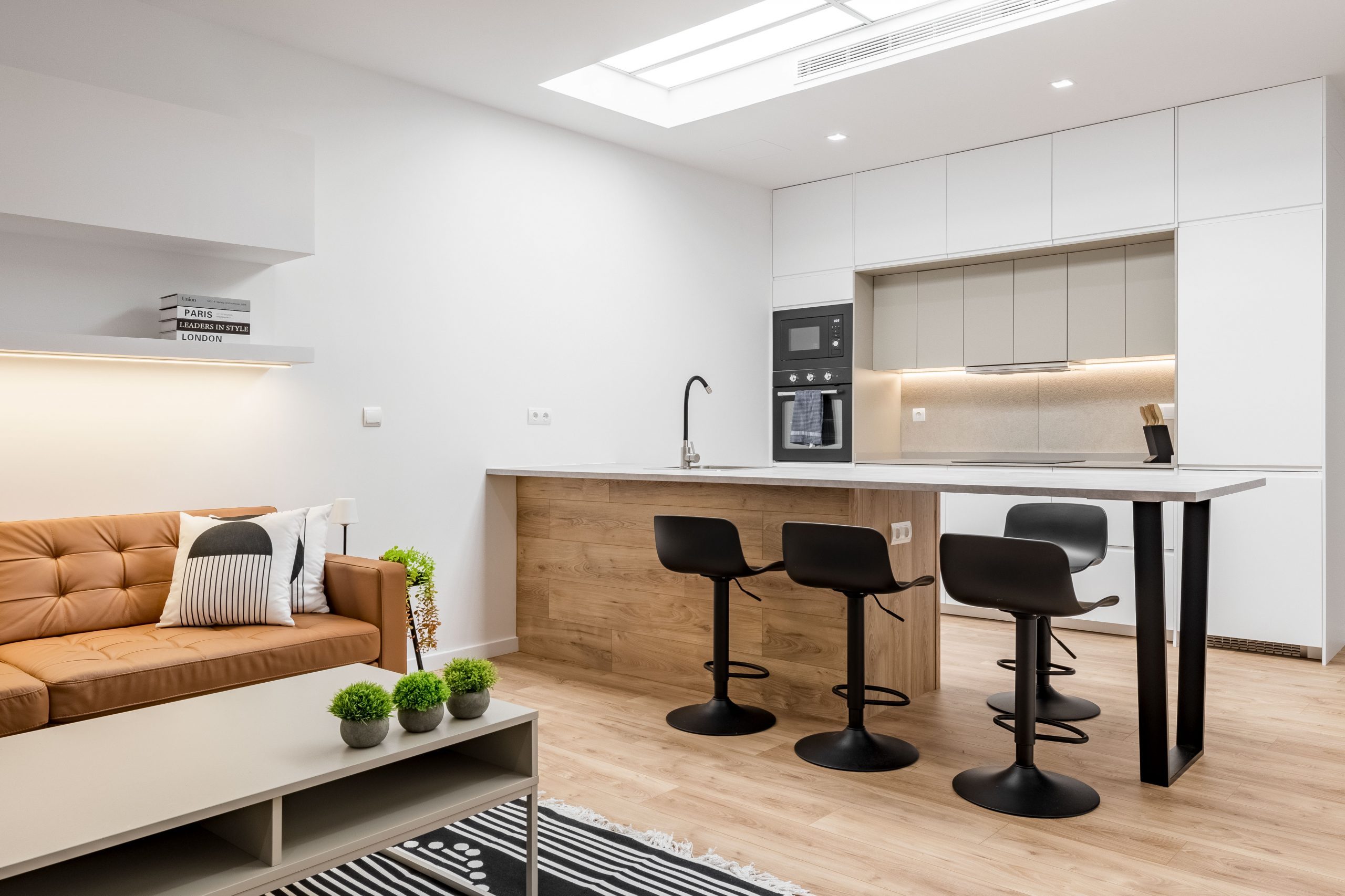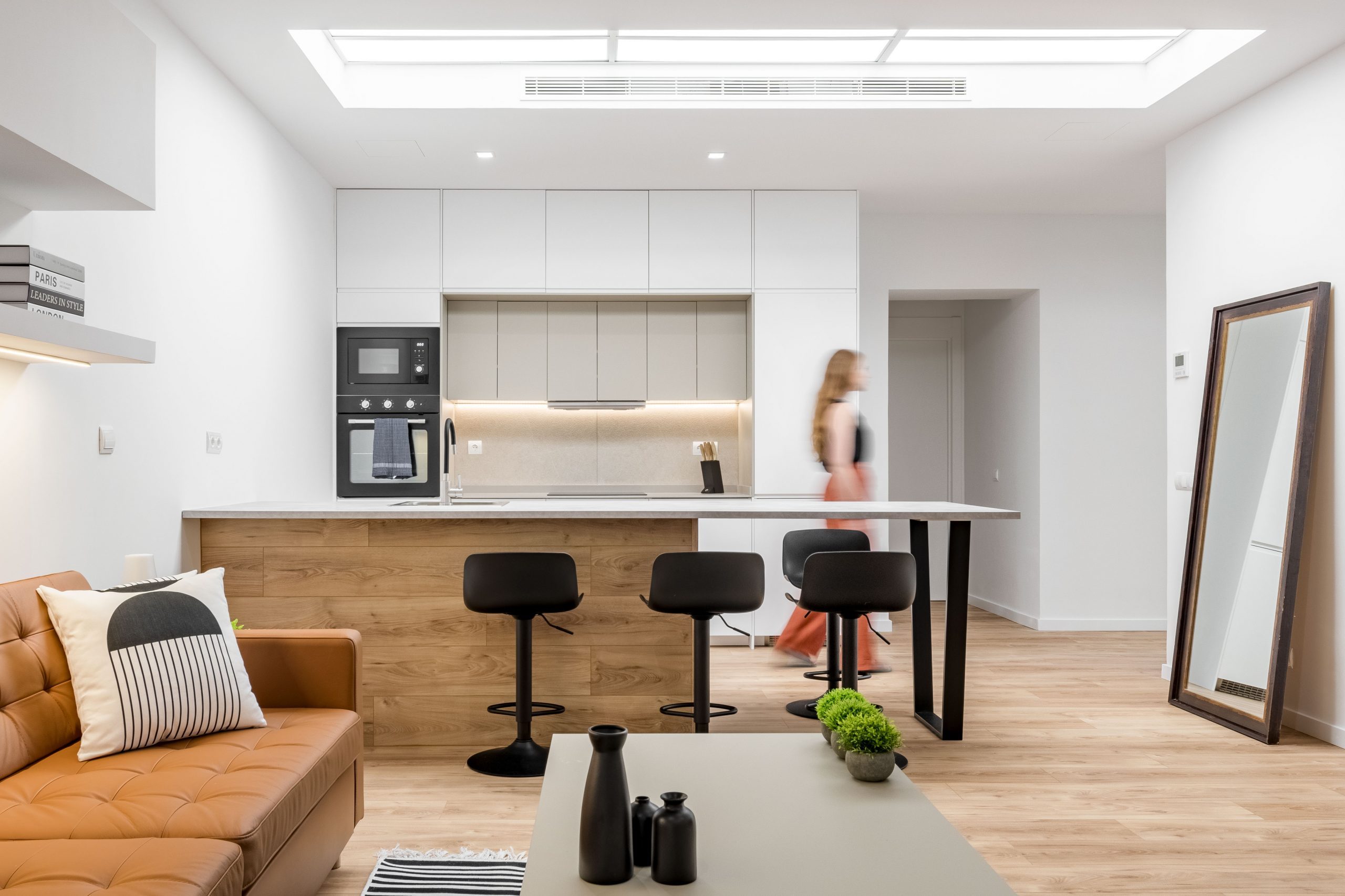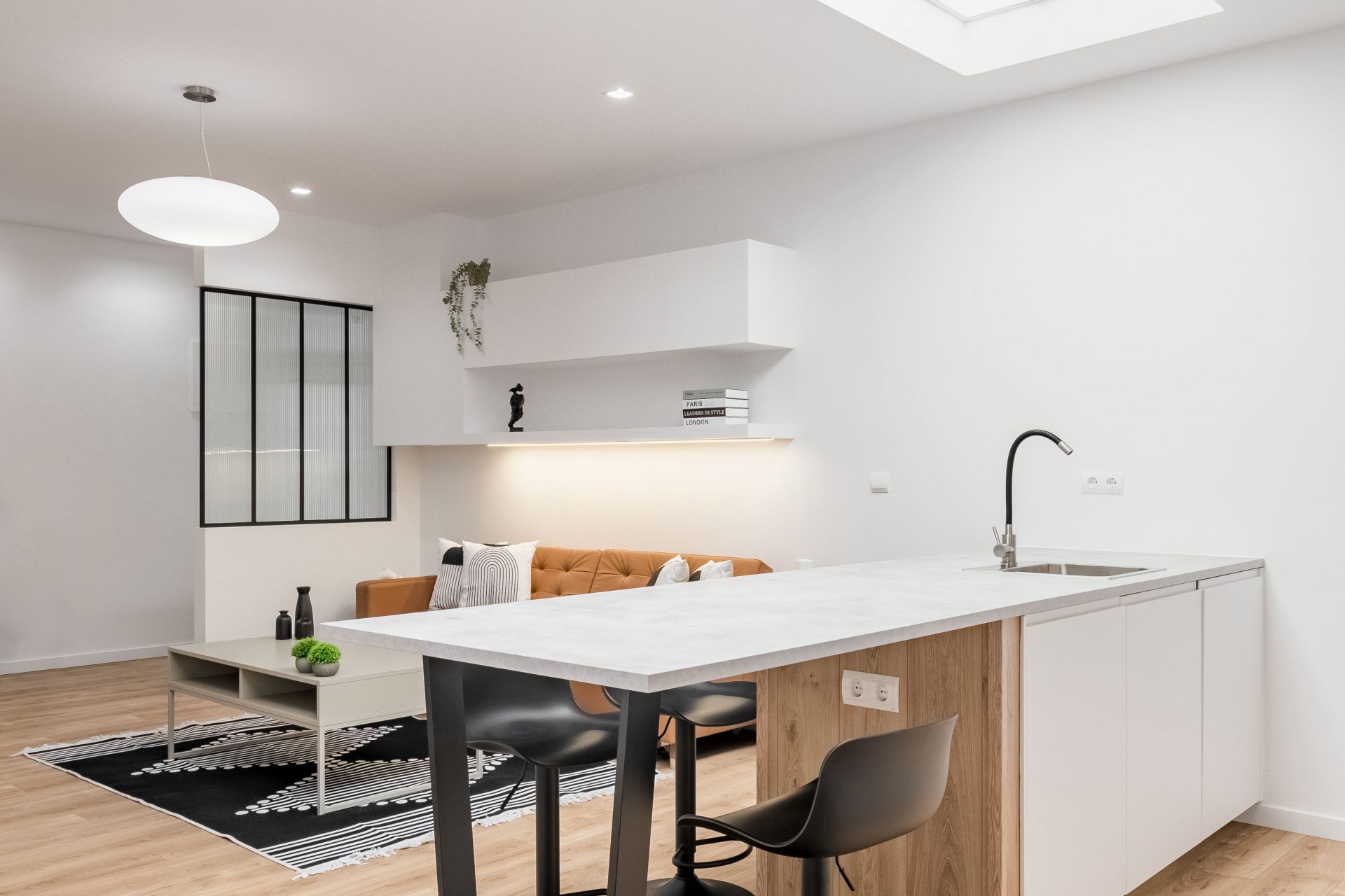 PLMN transformó un semisótano oscuro y desagradable en un acogedor espacio doméstico mediante la integración de la cocina en el salón por medio de una espectacular isla. La antigua cocina, situada en el punto más oscuro de la vivienda, se transforma en un pozo de luz gracias a un gran lucernario artificial, diseñado con mimo para convertirse en el corazón en torno al que giren todas las zonas vivideras del apartamento.