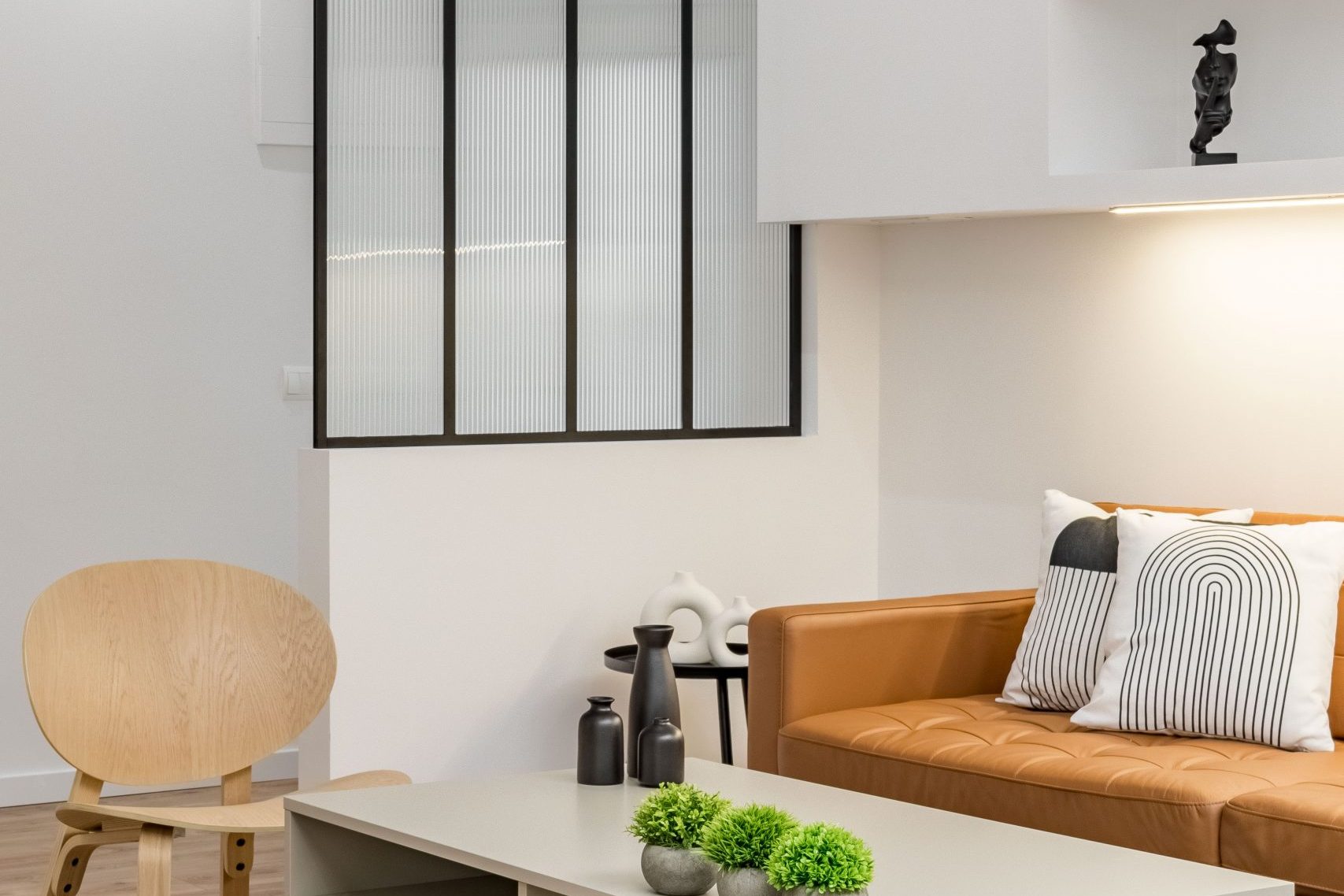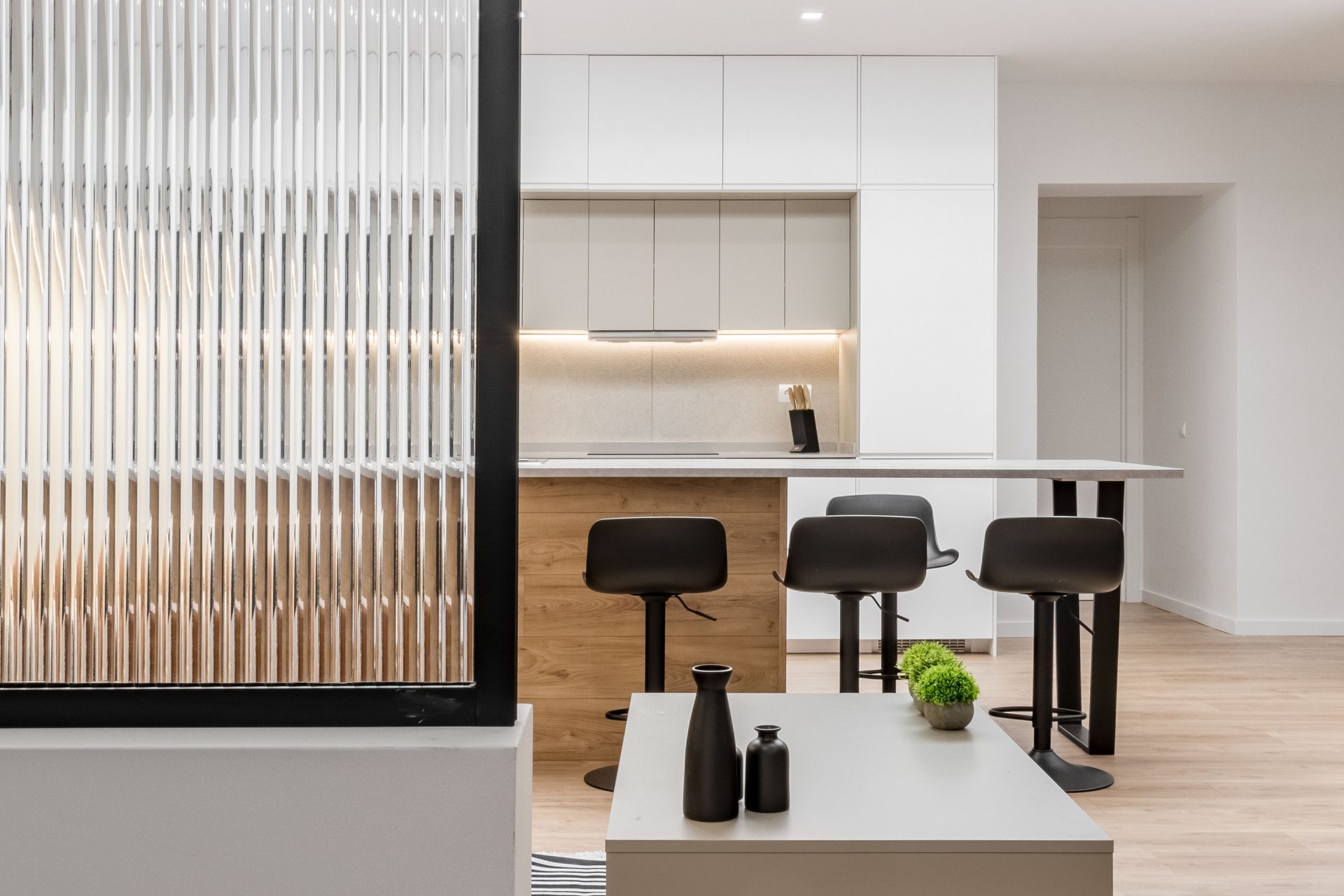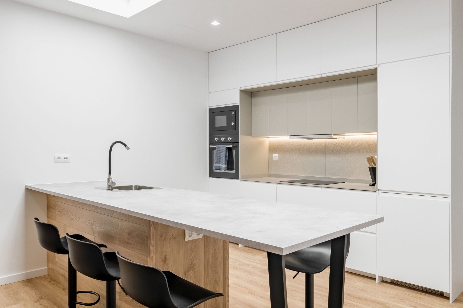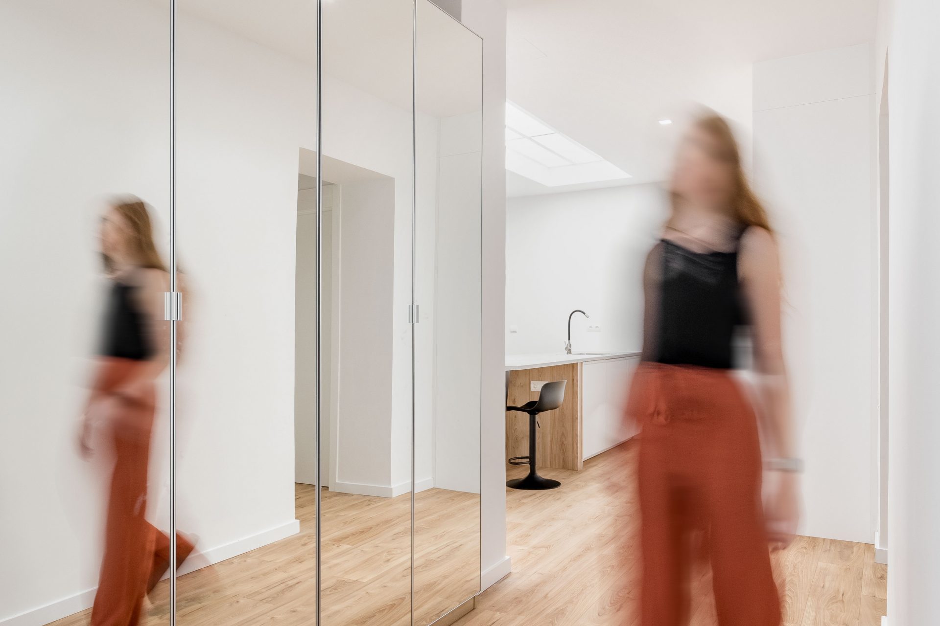PLMN transformó un semisótano oscuro y desagradable en un acogedor espacio doméstico mediante la integración de la cocina en el salón por medio de una espectacular isla. La antigua cocina, situada en el punto más oscuro de la vivienda, se transforma en un pozo de luz gracias a un gran lucernario artificial, diseñado con mimo para convertirse en el corazón en torno al que giren todas las zonas vivideras del apartamento.