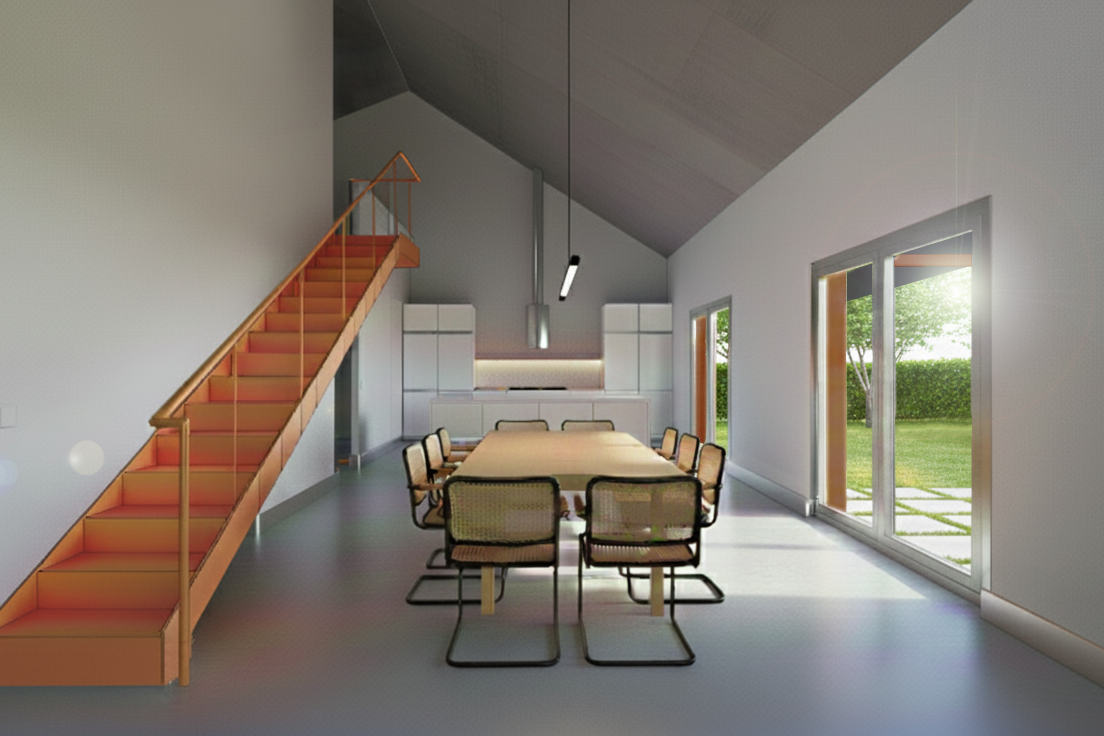 La vivienda RTM se plantea como un volumen sobrio y compacto. Su organización distribuye el programa en torno a una franja central de servicios que libera el perímetro para las habitaciones y los espacios comunes. El resultado es una casa contenida, luminosa y silenciosa, que interpreta la tradición rural desde una lógica contemporánea y funcional.