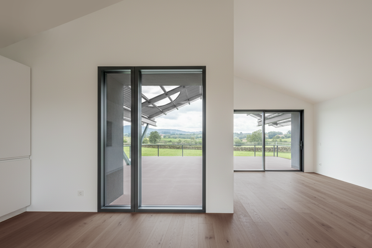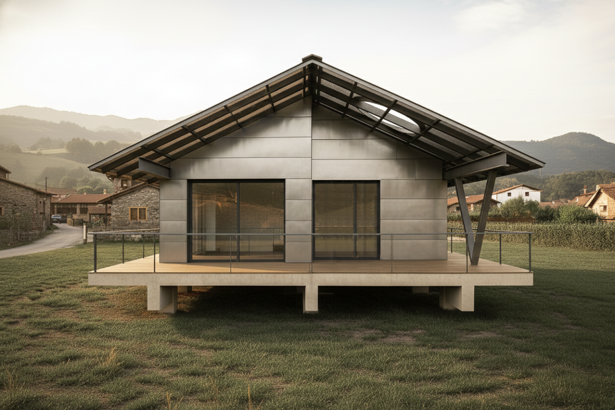 Esta vivienda unifamiliar aislada se asienta en un valle de Cantabria con serenidad y precisión técnica. Al elevarse ligeramente sobre el terreno mediante una plataforma de hormigón armado, la arquitectura evita cualquier gesto de arraigo forzado: la casa no se incrusta en la pradera, sino que parece flota sobre ella.