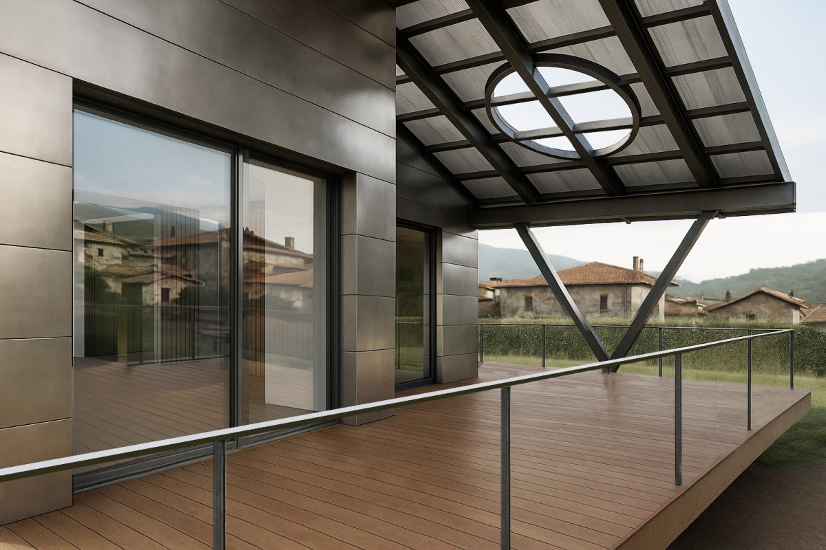 La vivienda se eleva sobre una plataforma de hormigón que le permite flotar sobre la pradera y relacionarse con el paisaje desde un plano abstracto. Sobre ella se sitúa un volumen metálico a dos aguas cuya piel reflectante incorpora luz, atmósfera y entorno. El porche frontal, con estructura en “V” y un óculo cenital, activa el espacio intermedio como dispositivo ambiental.