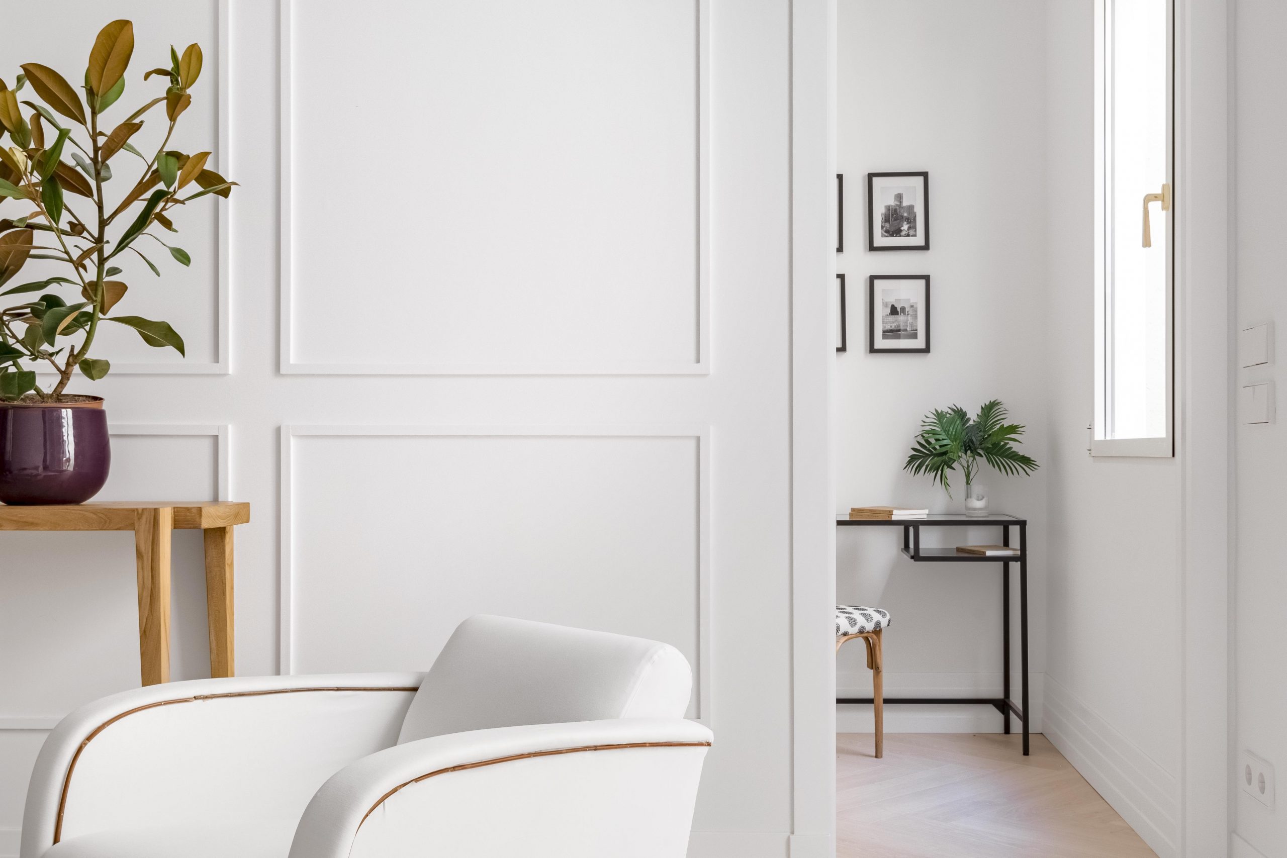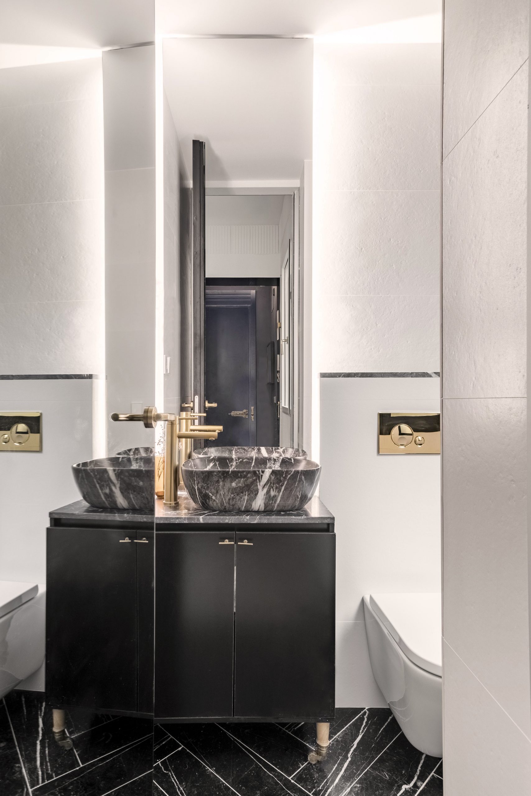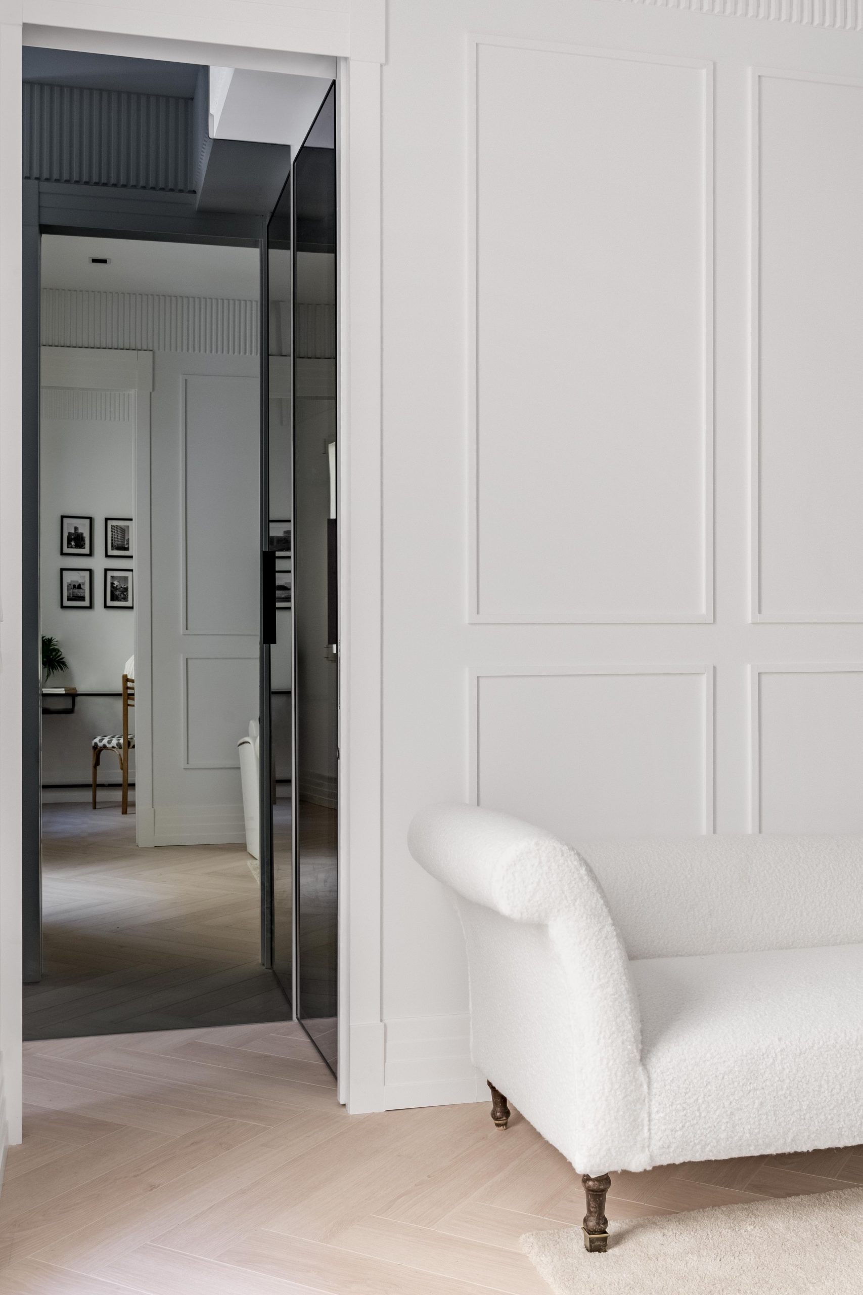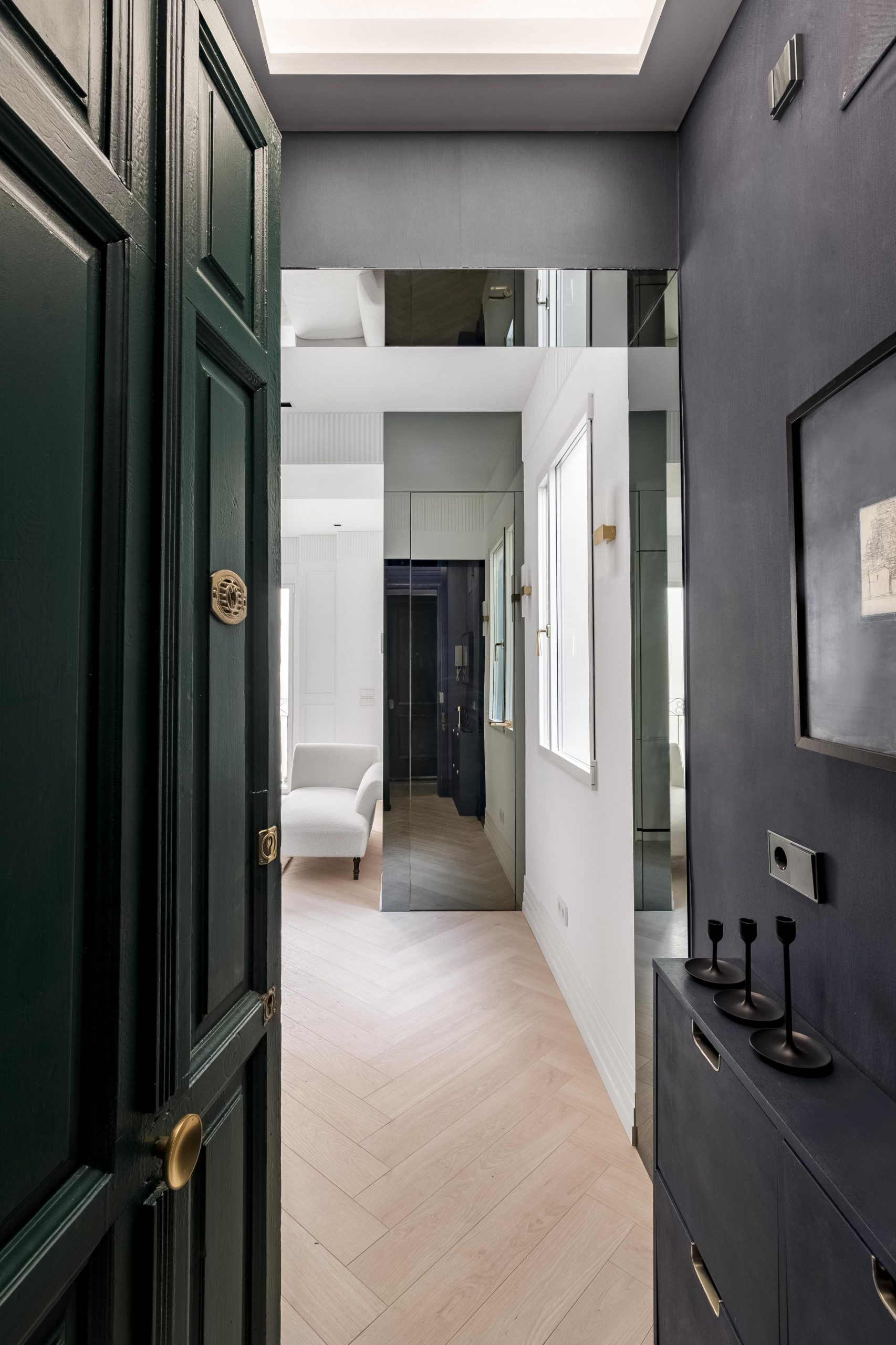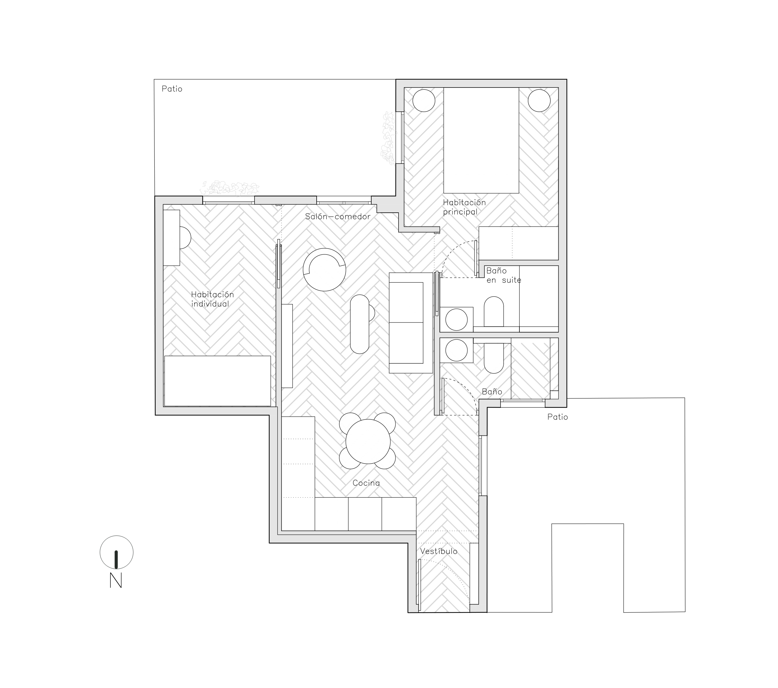 OyG transforma una vivienda oscura en un espacio luminoso, compacto y funcional. Mediante el derribo de los tabiques entre salón y cocina y el traslado de esta última al interior de la vivienda se transforma una vivienda privada de luz natural en un espacio continuo y luminoso. El sobredimensionado cuarto de baño original se divide en dos baños compactos totalmente equipados, ocultados a la vista mediante panelados y puertas sin marco y diferenciados cada uno con acabados únicos. A través de un cuidadoso uso de espejos para ampliar el espacio y umbrales de transición en tonos oscuros, la vivienda se expande visualmente y enfatiza la luminosidad y calidez de los espacios vivideros.